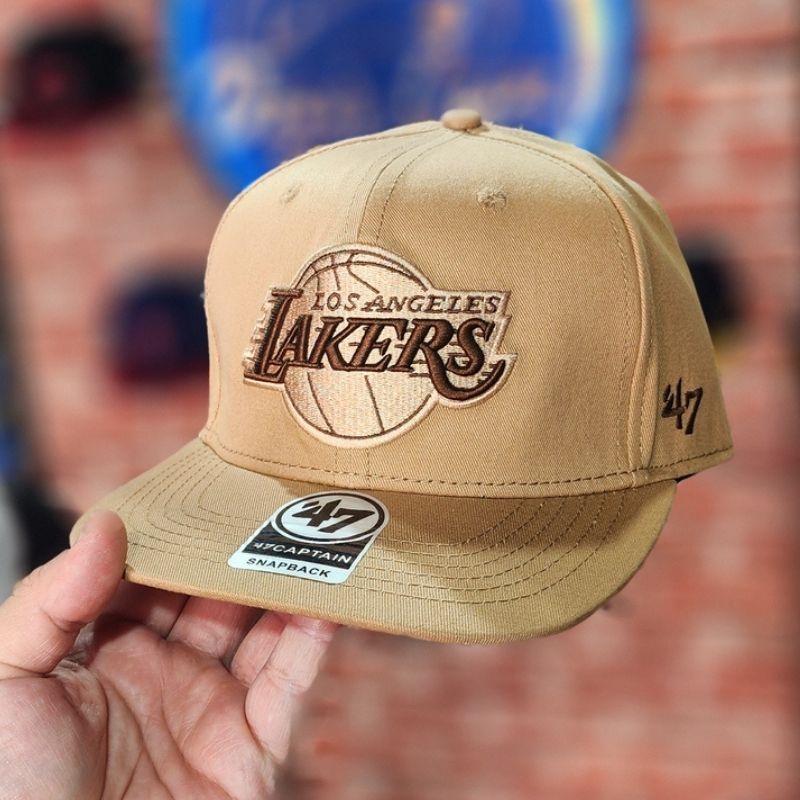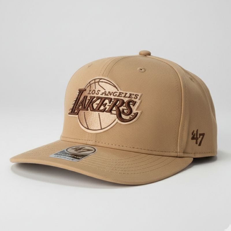 Casquette snapback ajustable du modèle « Captain » signée ’47 Brand, arborant une teinte beige (Tan) sophistiquée. Elle présente l’emblématique logo des Lakers brodé avec précision dans des tons bruns et beiges, offrant un style rétro-chic parfait pour une allure urbaine et tendance.