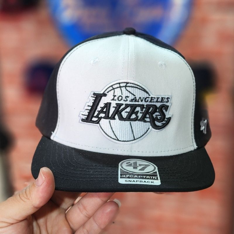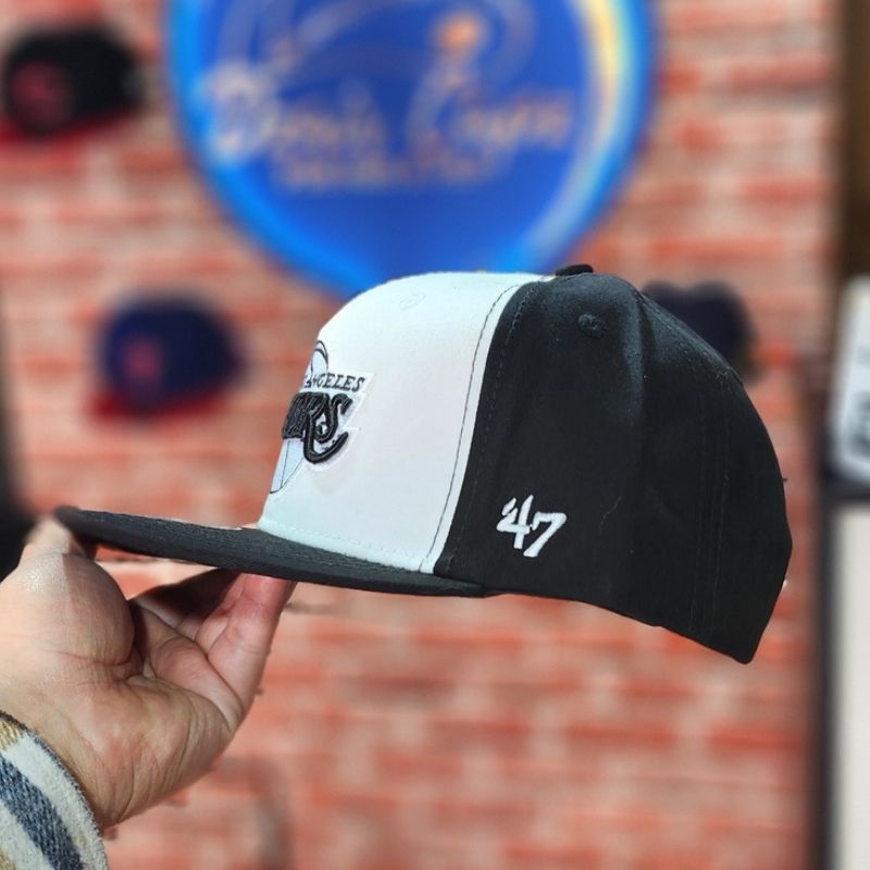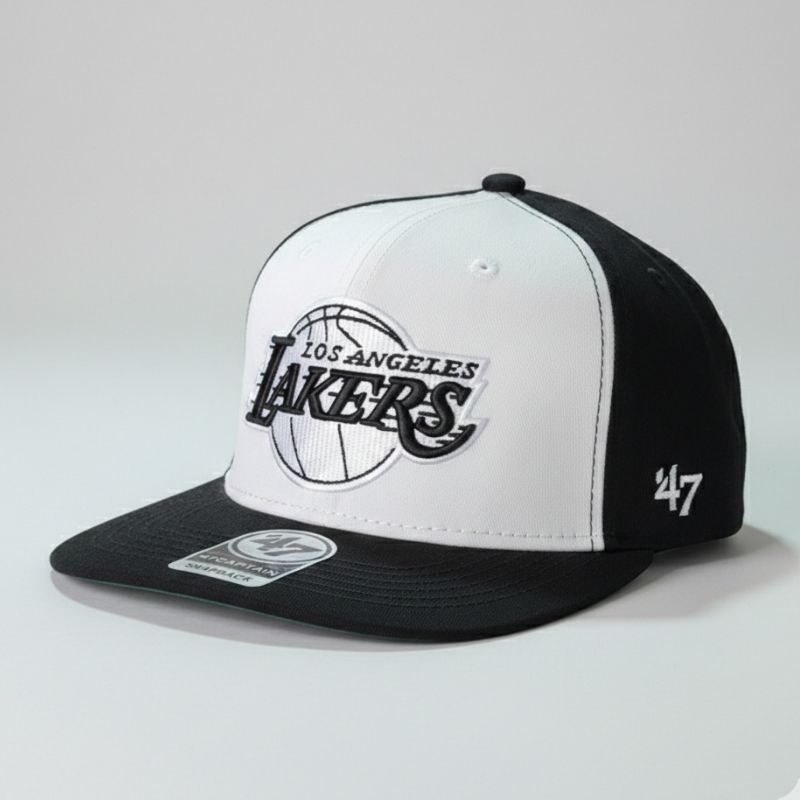 Casquette snapback ajustable du modèle « Captain » de ’47 Brand, arborant un design bicolore avec une face avant blanche et une couronne/visière noire. Elle présente le logo emblématique des Lakers brodé avec soin en noir et blanc, offrant un look sobre et stylé qui s’accorde parfaitement avec toutes vos tenues urbaines.
