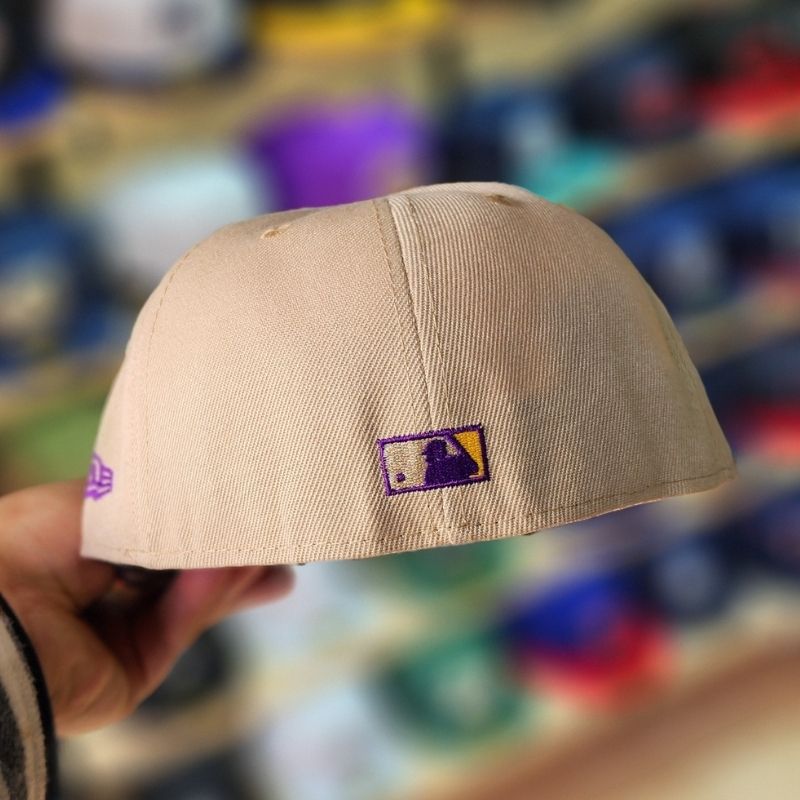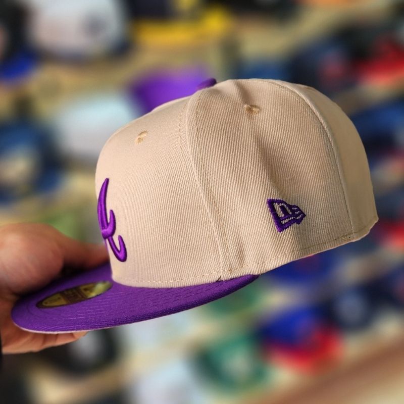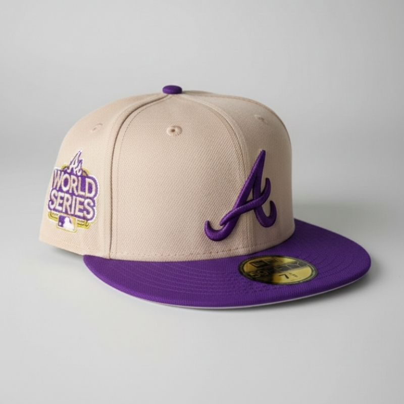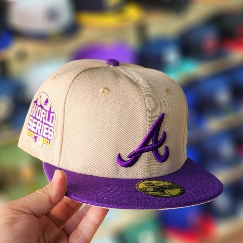 Casquette fitted arbore un mélange de couleurs moderne avec une couronne beige sable et une visière violette. Le logo iconique « A » est brodé en relief violet à l’avant, complété par un patch latéral commémoratif célébrant la victoire à la « World Series 2021 ». Un modèle collector raffiné qui allie fierté sportive et style urbain premium avec la qualité légendaire de New Era.