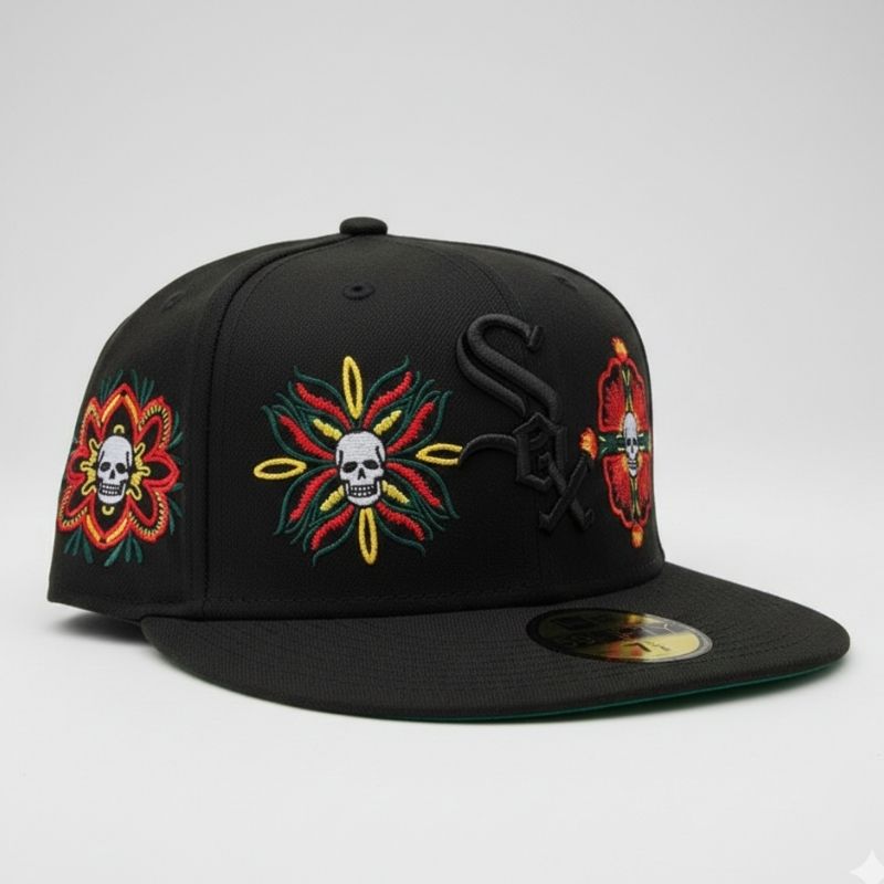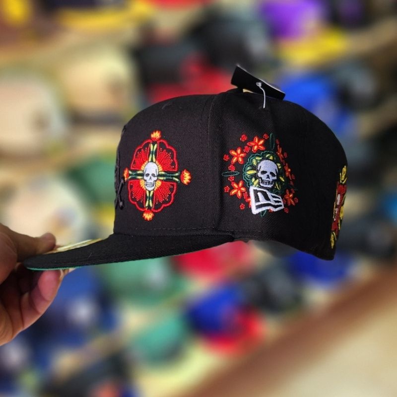 Une pièce artistique audacieuse en noir intégral, affichant le logo « SOX » dans une broderie ton-sur-ton discrète sur le panneau avant. La couronne est ornée de motifs complexes de têtes de mort entrelacées de fleurs aux couleurs vives (rouge, jaune, vert), offrant un look « rock » et avant-gardiste. Ce modèle exceptionnel repousse les limites du design traditionnel pour un style streetwear unique et une finition premium.