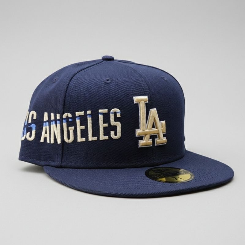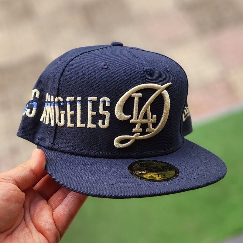 Casquette fitted propose un design artistique exceptionnel sur une base bleu marine. Elle arbore le logo « LA » entrelacé dans un « D » majuscule en style script doré, accompagné de l’inscription « LOS ANGELES » brodée en relief sur le côté du panneau avant. Un modèle raffiné au look vintage et premium, idéal pour les collectionneurs et amateurs de style urbain distinctif.