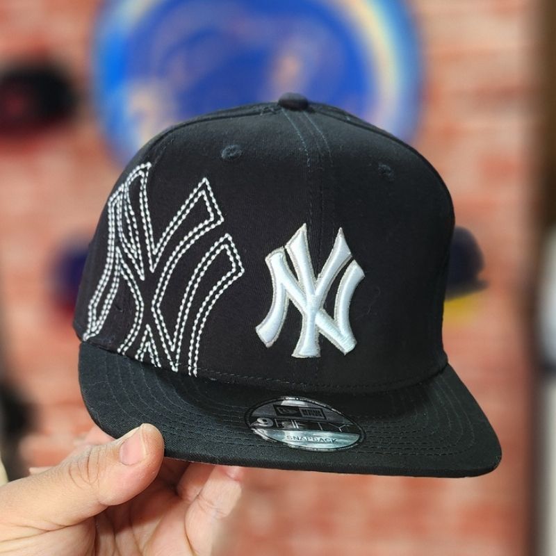 Casquette snapback ajustableau noire au design créatif, arborant le logo « NY » classique brodé en blanc à l’avant, complété par un imposant logo latéral en style « pointillé » géométrique. Ce modèle réinvente l’iconique logo des Yankees avec une touche artistique moderne, idéale pour ceux qui recherchent une pièce streetwear originale et distinctive.