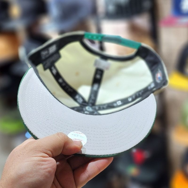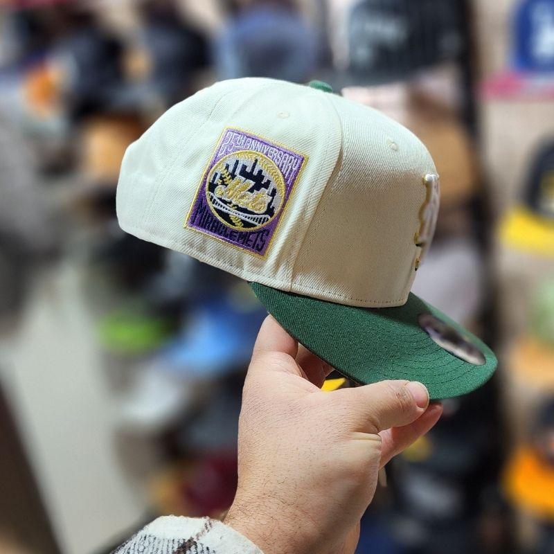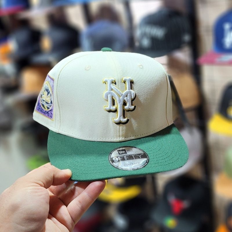 Casquette snapback ajustable se distingue par sa couronne blanc crème et sa visière verte contrastée, ornée du logo NY brodé avec précision et d’un patch latéral commémoratif « Miracle Mets », offrant un style rétro-sportif unique et confortable pour toutes les occasions.