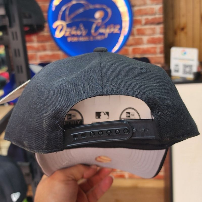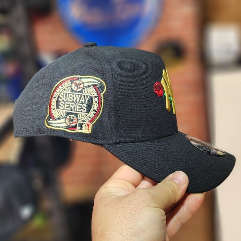 Un collector signé New Era (modèle 9FORTY) en noir profond. Elle se distingue par son logo NY brodé en fil doré agrémenté d’une rose rouge, ainsi que par l’écusson emblématique « Subway Series » sur le côté. Une pièce rare qui allie héritage sportif et élégance urbaine pour un style unique.