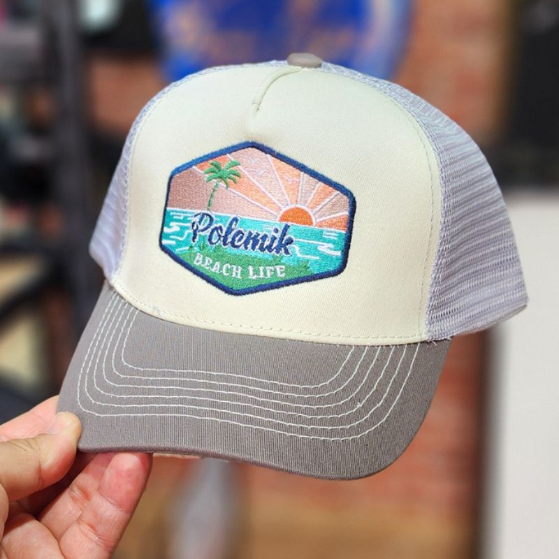 Une casquette Trucker au design estival épuré et aux tons clairs. Composée d’une face beige crème et d’un filet gris pour une respirabilité optimale, elle arbore l’écusson « Beach Life » pour un style décontracté. Idéale pour vos journées ensoleillées.